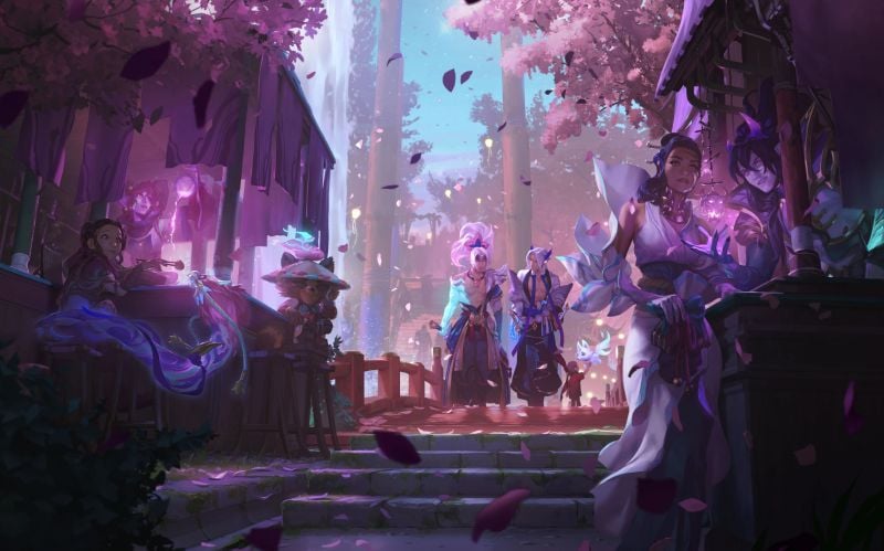 The original Spirit Blossom splash screen included Teemo, Yasuo, and Thresh. After Yone was released to LoL, the splash screen was edited to include Yone, but he's not a LoR champion yet so he's excluded from the count. If you mistook the dark-skinned woman for Karma you aren't alone, but that's actually an alt-version of Corina Veraza called the Spirit of the Bloom. Thresh can also be tricky – you really need to know his LoL Spirit Blossom skin to recognize his blue horns and skull-shaped lantern.