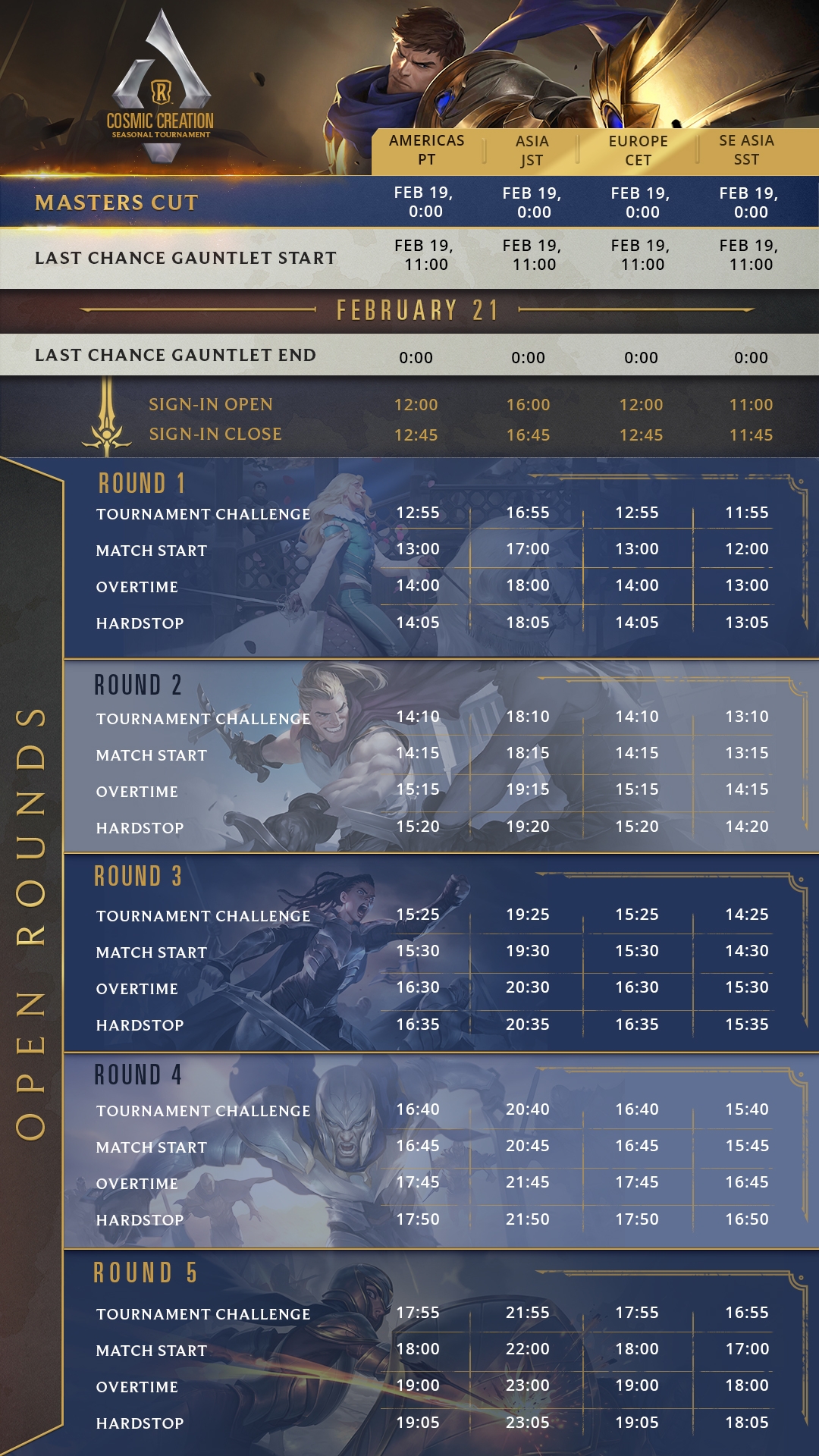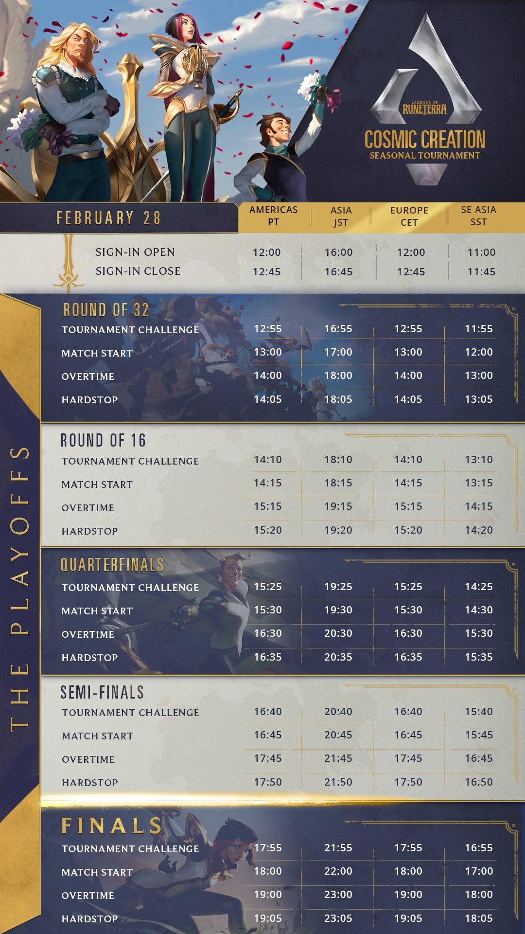 Runeterra's Swiss-system tournaments will have a total of 1,024 players from each of the Americas, Europe, Asia and Southeast Asia. They will brave it out against one another in open rounds. These open rounds will entail 5 Swiss Rounds in a best-of-three format until just 32 remain. This style of tournament means players are never knocked out, although the math would suggest that you would need to win each of your 5 games to have the best chance of qualifying for the playoffs!