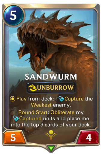 Sandwurm is a cool, flavorful card. Much like Rek'sai, the Sandwurm unburrows from the sands, devours creatures, and burrows back into the sands again.