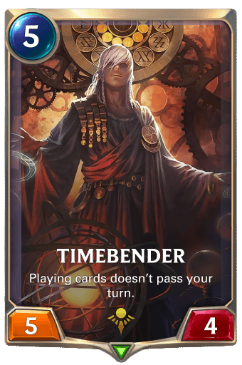 DeadlyTCG: "The Timebender is a cool card that breaks the rules of the game, allowing you to keep priority and choose how many cards you play before passing the turn (not the round) to the enemy. This would virtually give every unit in your hand "Focus speed"."