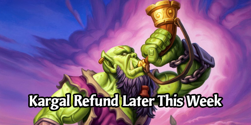 Quote From @PlayHearthstone In a hotfix later this week, Kargal Battlescar will become eligible for a full dust refund for 2 weeks. In the days following the hotfix, compensation will go out for players who dusted Kargal after the 20.0.2 patch notes were published.