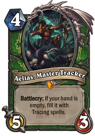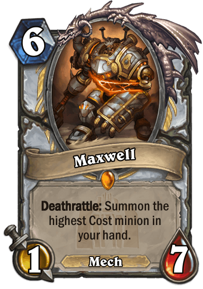 RadioInactive: "Aelias, Master Tracker was one of the cards I created early on in the expansion as a standalone good legendary that rewarded thinking ahead. Originally though, it filled your hand with Tracking spells. After tracking was changed, I didn’t think to change its textbox until I let others see my set for review and caught that for me. It's always good to show your ideas to others especially when you are looking at them for a long time. Maxwell and the rest of the priest mechs started as me trying to create a more board and buff focused priest, which I felt would be more fun than the current control/big archetypes that they were locked into. The point of mech priest is to summon strong sturdy mechs that could be healed and buffed over multiple turns. Maxwell definitely fits the stickiness part, incentivising your opponent to leave it for as long as possible which you can then buff into a real threat itself."