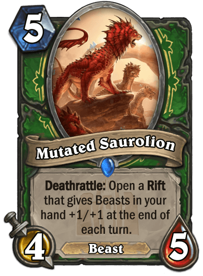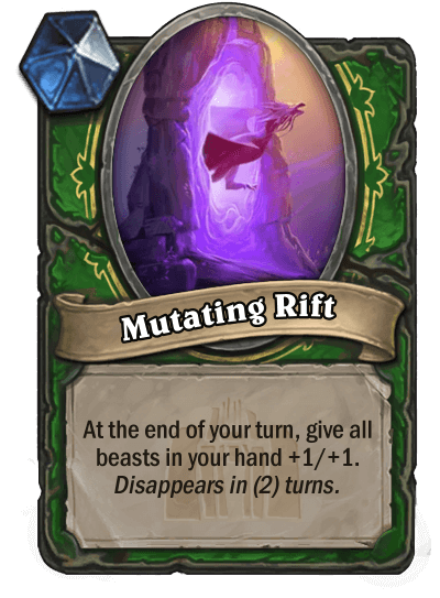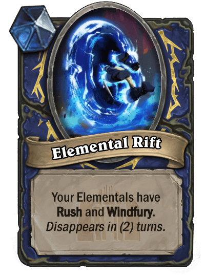RadioInactive: "Rifts started out as a way to display passive effects without relying on external counters like quests or the demon hunter sigils. The card Supercharger originally started out giving rush and windfury to elementals you played next turn, but I was struggling to figure out how to display that on cards in your hand. I eventually decided on summoning a temporary minion that would provide the effect instead. Eventually to save space on the card, I standardized all rifts to be only active for two turns and designed the rest of them around that."