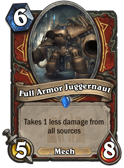 RadioInactive: "Originally the keyword created for the set was resistance, which would’ve caused minions with it to take less damage at a time equal to its resistance level. It has remained somewhat as a tribute on the cards Full Armor Juggernaut and Charged Zapper. I ended up scrapping it due to it only punishing aggro, not doing much against anything else and not really being flavourful outside warrior or paladin. Rifts are definitely a more flexible mechanic, there’s a rift card for each class in the set."