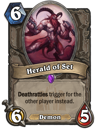 Limiting myself did prove to be both challenging and beneficial, having to use the keywords in new and interesting ways. For example, Storming Sheut didn’t Discover a certain type of card, but rather Discovered from a certain location. Having a focus on Deathrattles meant that I could create cards like Herald of Set that interacted with the mechanic in an appropriate meta."