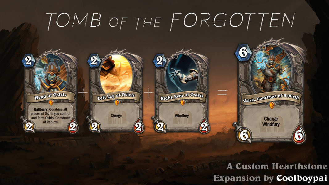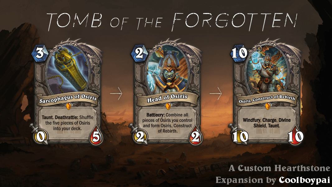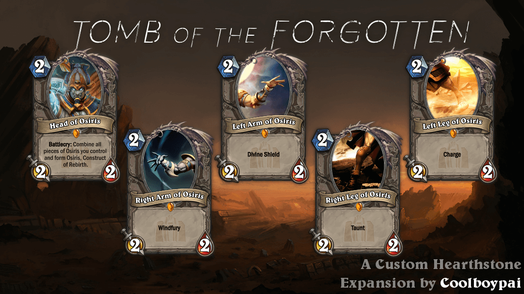 Hello everybody and welcome back to another Fan Community Spotlight. This week, I'm doing something slightly unusual which is that I'm actually showcasing an extremely old custom expansion. This set is called Tomb of the Forgotten and was made all the way back in 2016. This set is themed around the tombs found in Uldum and draws from a lot of ancient Egyptian inspiration. If this sounds like Saviors of Uldum, then this is basically an interpretation of a very similar theme from way back when.