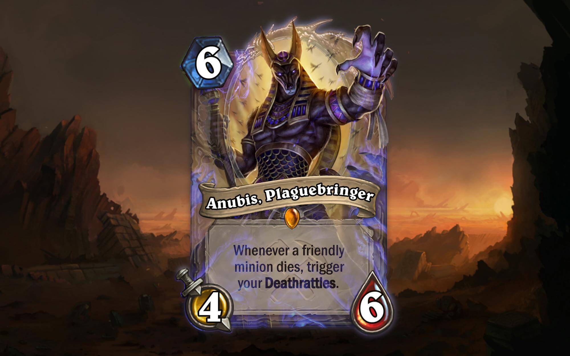 Coolboypai: "Discover and Deathrattle were obvious matches for the set’s theme given Egypt's relation with both the afterlife and archeology. At the time, Discover was a new and unexplored mechanic with a lot of potential. With the two keywords, there wasn’t a lot of room to effectively focus on a third one.