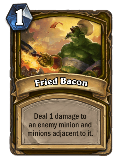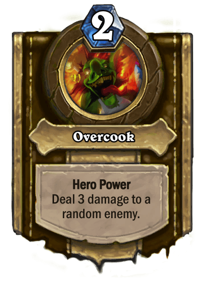 Your base Hero is Warchef Gordo (a pretty sweet pun if you ask me). Your base Hero Power is Cook, which deals 2 damage to a random enemy. With Justicar Trueheart or Baku the Mooneater, this can be upgraded into Overcook, dealing 3 damage to a random enemy instead of 2.