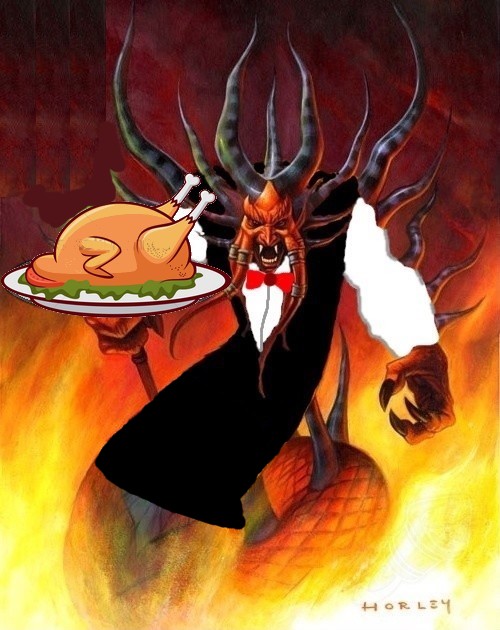 "Yes, the unused card art I made for "Flamewaiter" (a portmanteau of Flamewaker and waiter) which I, unfortunately, had to scrap because I didn't have room for it. It was supposed to go alongside the similarly themed Ragnaros, Kitchenlord (shown above).
