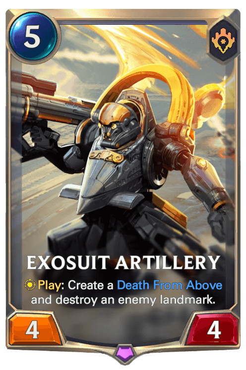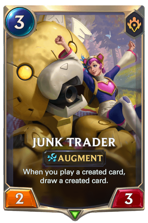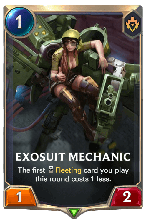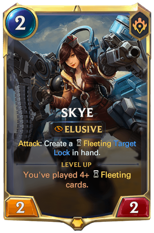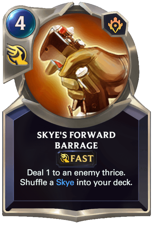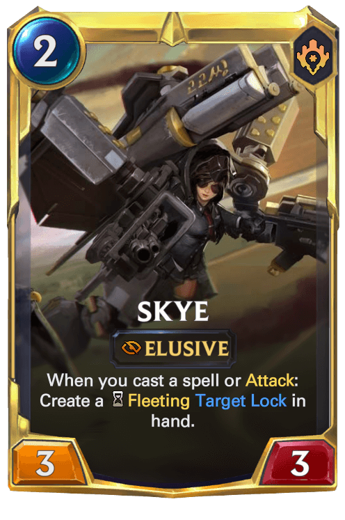 FenrirWulf: "One of my personal favorites is the champion Skye. I feel that out of all the champions I created, Skye had the best resemblance to her in-game counterpart. In game, Skye’s basic attacks marked an enemy with the Target Lock. Her first skill, Forward Barrage, which plays very similarly to Lucian’s R, dealt more damage to heroes who were marked with the Target Lock. Her ultimate, Death From Above, also assumed two different patterns of stunning artillery fire depending on whether we aimed the skill directly on the marked target, or away from it. Hence, I feel like I was able to properly capture that feeling onto LoR. Proper reenactment aside, I also personally feel that Skye’s region package (PnZ) felt the most cohesive to me, because a large majority of the cards had clear synergistic or thematic relations to Skye herself. Cards like Junk Trader capitalized on Skye churning out a lot of created cards, and most of the Exosuit crew offered direct support to Skye in forms of fleeting or spell synergies (to add, since I decided to slot in Skye as an Exosuit, she fits in as the 2 mana unit, while the other Exosuits are 1, 3, 4 and 5 mana).