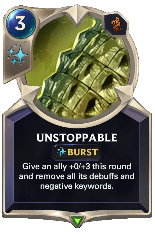 Another card I’d like to give extra attention to is Unstoppable. It’s not a particularly eventful card, but I do wish that cards with effects similar to Unstoppable were actually printed in the LoR game itself. We’ve experienced multiple metas where Hush as a card was egregiously unfun to play against, and I think cleansing effects could’ve helped tremendously during that period of time.
