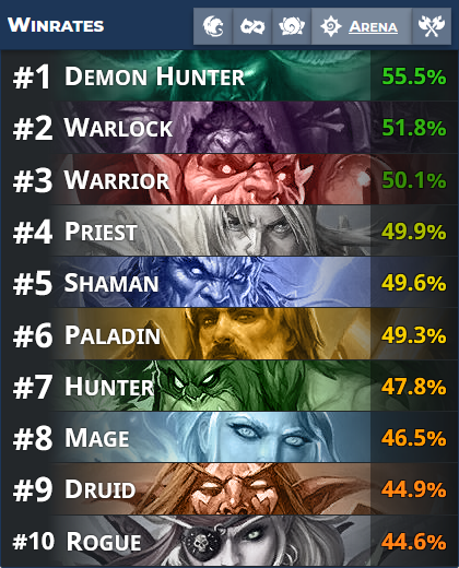We’re in the process of deploying a small server-side hotfix that will update the appearance rate of cards in Arena to ensure class balance remains close to the ideal 50% win-rate. Specifically, the win-rate of Demon Hunter, Paladin, Shaman, and Warlock should now be decreased. The win-rate of Druid, Hunter, Mage, Priest, and Rogue should now be increased. The win-rate of Warrior should be roughly the same as before.