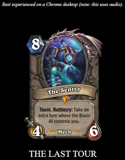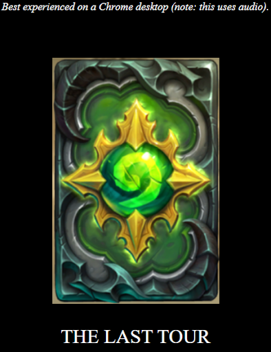 As soon as you boot the website up, the first thing you see is a card back, along with a note that it contains audio and is best used on a Chrome desktop, and also the name of the set, THE LAST TOUR.