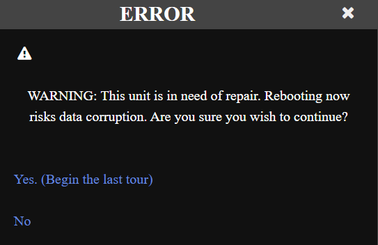 Don’t worry, it’s not a real error. No, your computer hasn’t been infected by anything. This is all part of the immersion. Just click "Yes. (Begin the last tour)" and then you can start.
