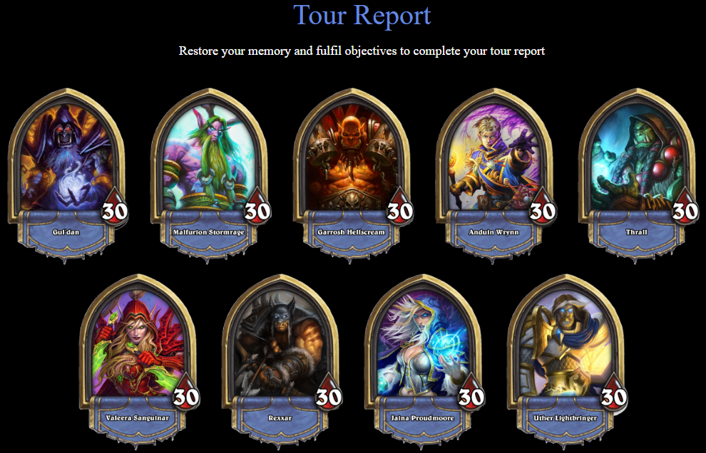 Whilst viewing the class menu, you can also click on the “Tour Report” which will take you to a menu of Report logs. They become unlocked as you progress through the story, and there are 21 of them in total. Clicking on one will take you to a certain Neutral card, which just like the class cards, reveal their own part of the story.