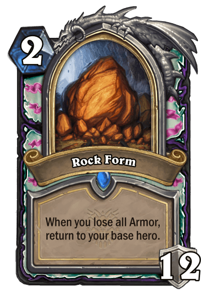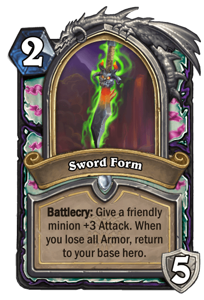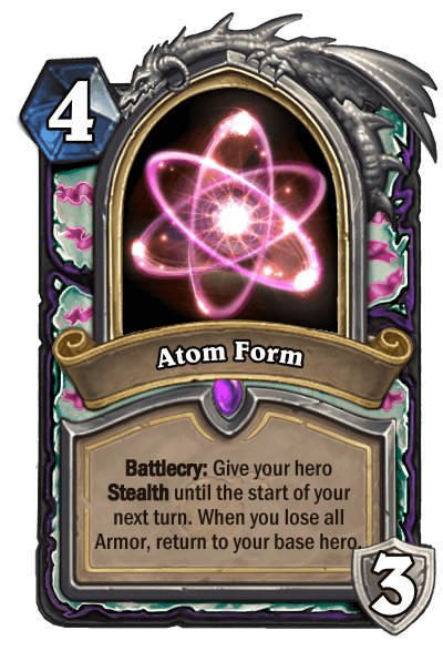 Costless cards are cards that initially start with a question mark as their Cost. They can't be played while their Cost is in its question mark state, but this Cost can be set to a number by playing specific cards that affect Costless cards. "Form" cards are non-Legendary hero cards that work like regular hero cards in that they grant you Armor, a new Hero Power and have a special effect when played. Unlike the traditional Legendary hero cards, the form you assume from "Form" cards are temporary and you will revert to your normal form after you lose all of your Armor.