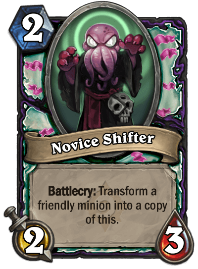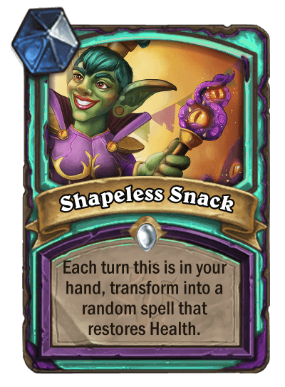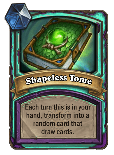 Then we have the Shapeless cards, who change their form each turn in your hand, and was created to improve the versatile side of the class and to add even more flavor to it. But as we're all aware, cards with this mechanic like Shifter Zerus and Shifting Scroll sucks hard, so in order to make Shapeless cards "playable", I've made them transform into very specific cards who'll make an impact on the game, the main example of this is the Shapeless Tome and the Shapeless Snack.