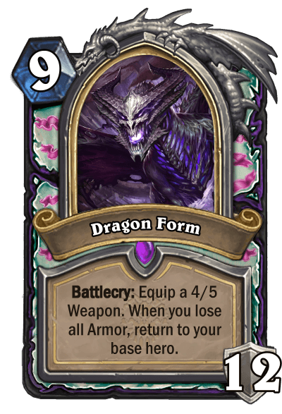 And now we have the polemic Forms, who are non legendaries temporary hero cards, who lasts until you lose your Armor, but can be extended if you managed to save some Armor from a previous form. The story of this mechanic is quite funny, the idea came from the combination of two factors, the first one was a scrapped card from my future expansion, who was a Neutral hero Card who only lasted until you lose the Armor (or your Mana in some versions). Even though I've liked the concept, that shit was IMPOSSIBLE to balance, so the card was scrapped, but the concept was stored. The other factor was a joke article posted here about a fake leak of the last expansion of the year of the dragon made by Shadows. In this fake set called War of the Dark, the main attractive was the shitload of non legendaries hero cards in it, and while it was just a joke, I was looking at it and wondering "… Why not?", and by combining those two factors, I've created the Epic Dragon Form, the Rare Murloc form and the Common Water Form (the last two got replaced by Rock Form and Sword Form).