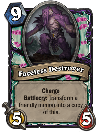 MrRhapsody: "The idea came from a random brainstorm a had a long time ago, when I was messing with the idea of making a custom class. My main option was to make a Nightblade class, who was a half Mage half Rogue who fought using secrets and tricks, but the thing is, Mage and Rogue already do that, so I ended up scrapping the class. But I was still tempted to make a class specialized in tricks, confusion, infiltration and clean death, and when I was planning the last cards of the Rock in Azeroth expansion, I've randomly decided to make a class and some cards around that concept, and then I ended up with 1/3 of the Shapeshifter's cards done in one day out of instinct. Drakonic Mistress and Faceless Destroyer was one of the first cards.