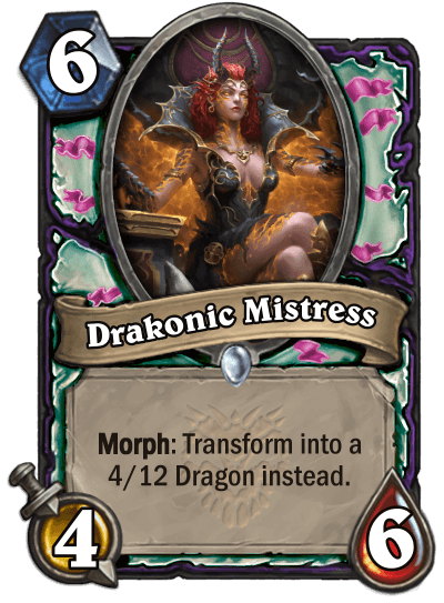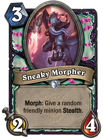 Let's start with Morph, the keyword was created mostly to add more flavor to the class and to make the Hero Power not useless in the late game. The first cards created with this mechanic was Drakonic Mistress and Sneaky Morpher.