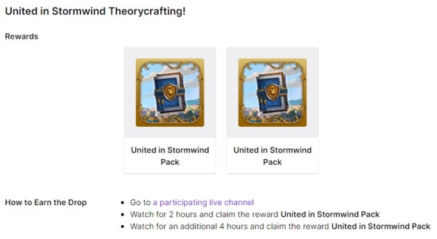 - Watch two hours of Hearthstone on participating channels to claim 1x United in Stormwind pack.