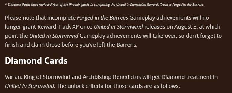 Ah, well. Hopefully one day we can get to the point where everything switches together along with the fresh Rewards Track, which would undoubtedly simplify things for all involved while making the most sense. Right now we even have this curious situation when the Barrens Tavern Pass is still active until August 3 and actually provides the full XP bonus for the new Stormwind Gameplay achievements - but of course the vast majority of them require new cards to be playable for their completion.