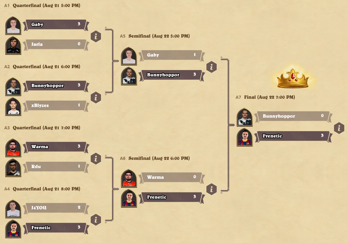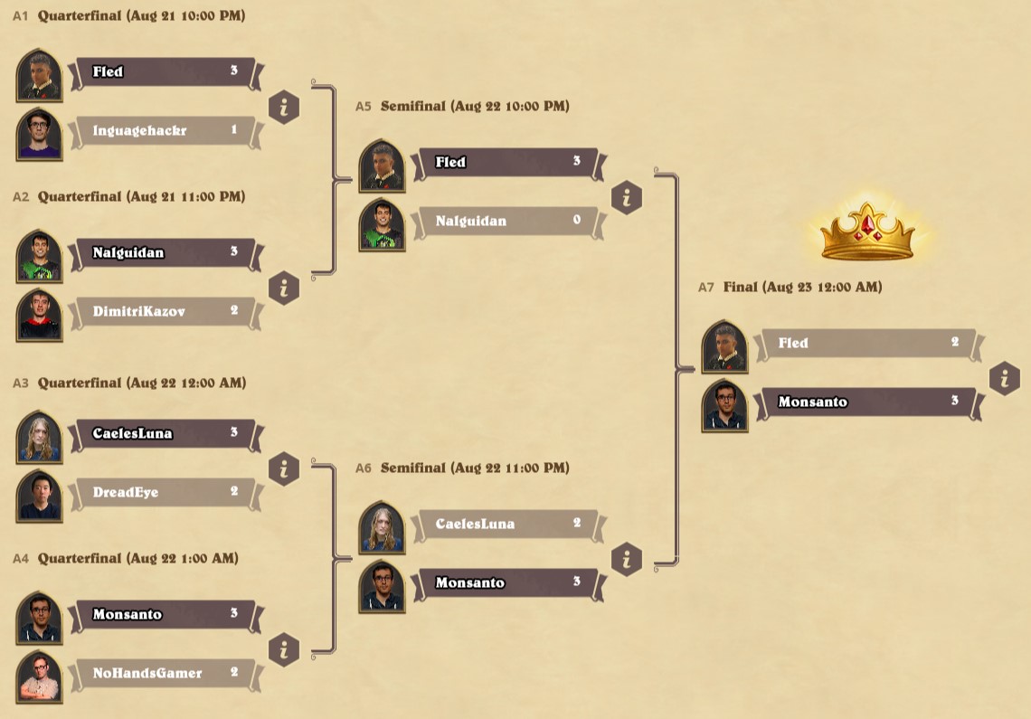 The success of Season 1 winners continued in Europe where Frenetic sweeped Warma with his Shaman and Bunnyhoppor with his Mage. Gaby also added another chapter to his impressive results on his maiden season by reaching top 4 again after winning last week. In Americas, the third Season 1 champion Nalguidan was also able to reach top 4 but got swept by Fled's Face Hunter in the semifinals. The final was a tale of Thralls as Monsanto was close to getting swept by Fled's Shaman before reverse-sweeping to victory with his own Shaman.
