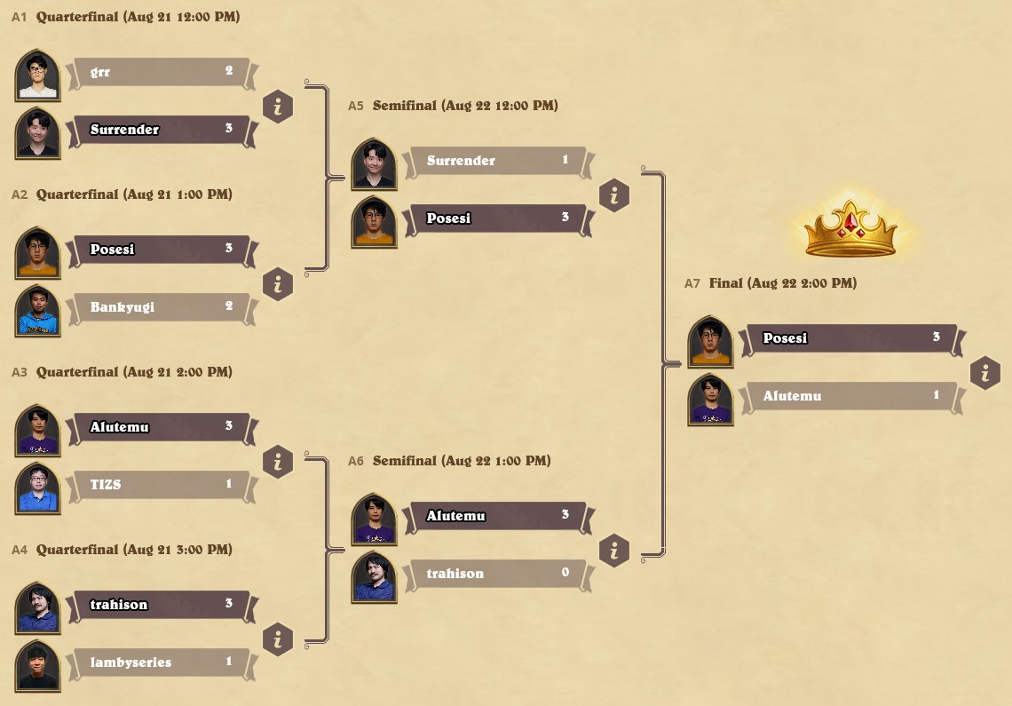 Last Hero Standing seemed to suit the Japanese in APAC as they claimed three of the top 4 spots. The more experienced duo Alutemu and posesi were able to reach the final by beating the newcomer Trahison and Surrender, the only non-Japanese left. The final between mirror lineups ended in posesi's triumph and the five points were very welcome after he got zero points last week.