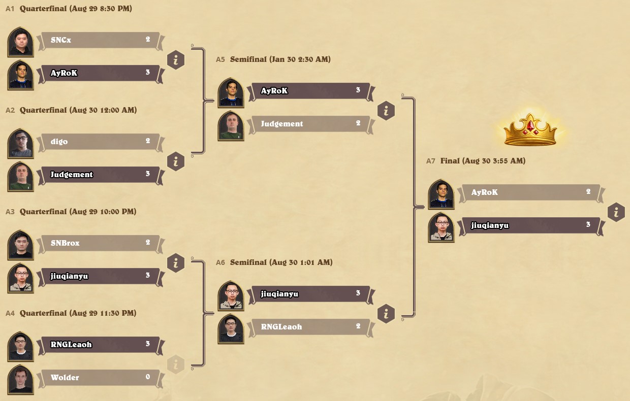 Another Masters Tour, another strong performance from the Chinese players. Timezones didn't matter as the Chinese took half of the top 8 spots to their name. With jiuqianyu's extremely narrow win over AyRoK in the final, four of the last five Masters Tours have been won by a different Chinese player, a streak only interrupted by Gaby in Masters Tour Orgrimmar.