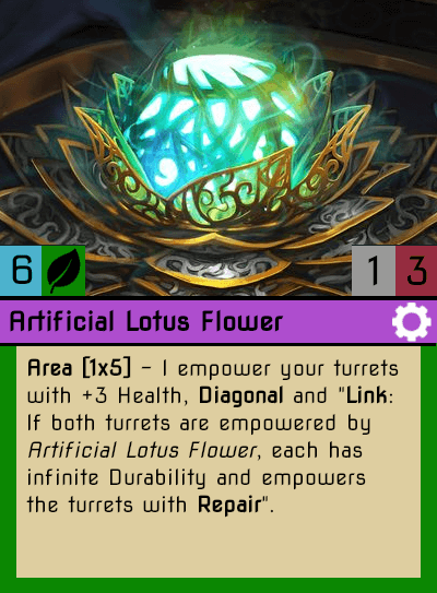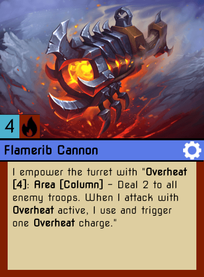 Turrets are minions you mostly place near the track you’ve built (those with Airdrop don’t have to), and they usually need to wait a turn before becoming ready unless they have Readiness. Their attack range is usually tied to a cross in a 3x3 hex area (same area as King’ movement in Chess, but can only attack enemies in the same lines as if they were a Rook), but some turrets can attack diagonally, attack from further range or even attack all enemies within range. Base range is Range [1], but if the keyword appears, it means the attack range is further than 1.