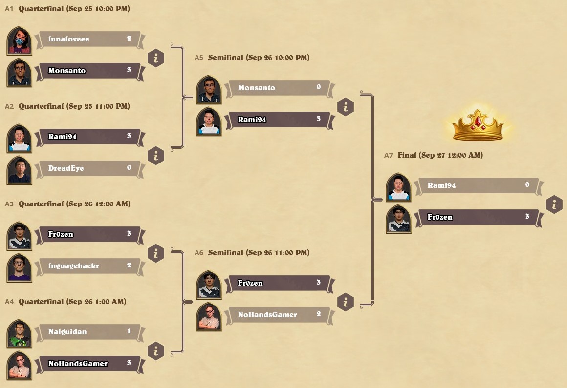 The nerfs to Illucia and the Warlock Questline certainly affected the tournament meta this week. Priest was essentially gone with only three lists brought, while the amount of Warlocks ranged from Europe's 3 to APAC's 8. Rogue and Demon Hunter were accompanied by Druid as the new top 3 picks, each reaching 10+ picks in all regions. While Warrior's Pirates got a triple buff, no Questline Warriors were brought; the class still reached a respectable 15 picks overall, spread between Control and Big Warriors. The Mage buffs encouraged muzzy to bring a Hero Power Mage while every other Mage player kept trusting the Questline variant. Europeans still did not bring Paladins while APAC saw four of them brought. In Americas all 10 classes saw play for the first time since the opening week of the season.