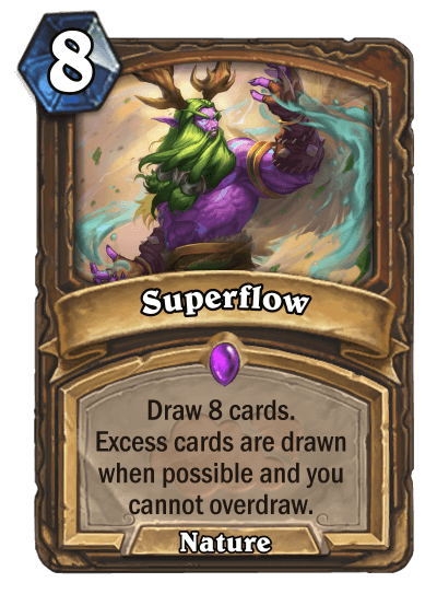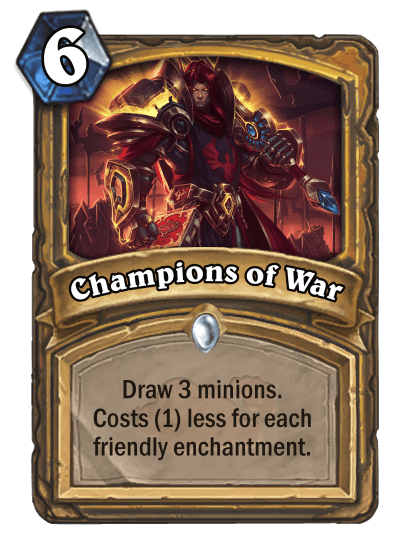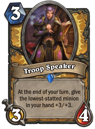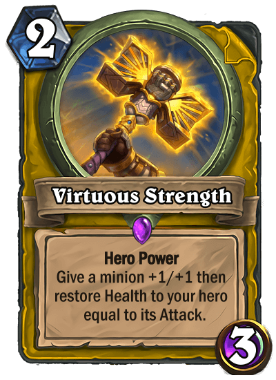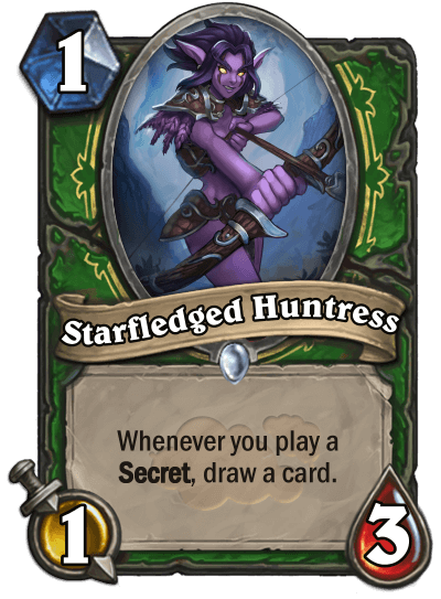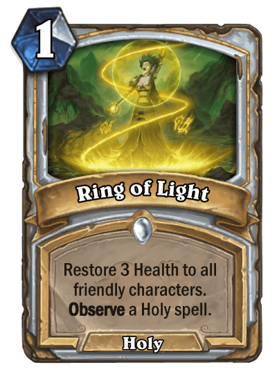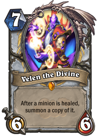 As for the hardest ones, the ones that I ended up with the least amount of progress on were Hunter and Priest. I wanted to make a Secret theme for Hunter (and that gave way to cards like Starfledged Huntress and Prowler Companion), but then I couldn’t think of anything to give them and it ended up leaving me stuck. I wanted Priest to have some interaction with Holy spells and healing resulting in its only two cards I made for it which are Ring of Light and Velen the Divine, the former of which is actually part of a cycle across multiple classes.
