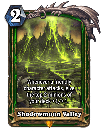 If you notice that the border color for Shadowmoon Valley is different than other Demon Hunter cards, this is because Demon Hunter does not have its own template for Location cards, meaning that I had to use a similar-looking custom class border instead.