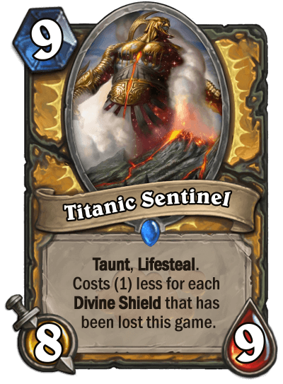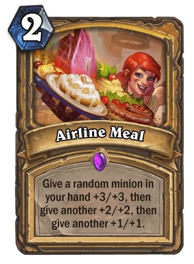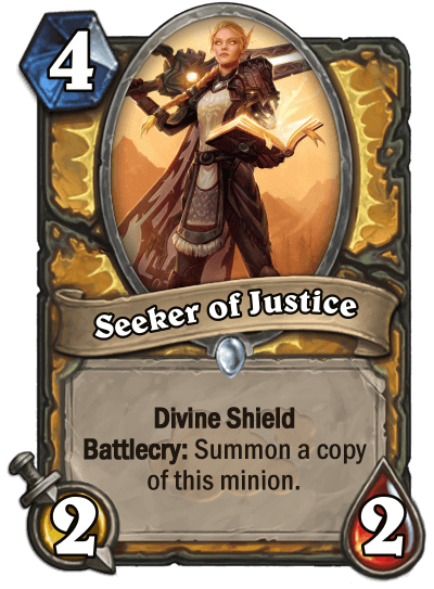 "The easiest class, or rather the first (and only) one I finished was Paladin. Paladin’s theme of Divine Shields ended up coming naturally when I themed the set after Silvermoon (and cards like Silvermoon Guardian and Blood Knight exist, both using a Divine Shield theme) and when I made Titanic Sentinel. Seeker of Justice was a card I made fairly early on the class and then that later manifested its second theme of handbuffing with cards like Airline Meal.