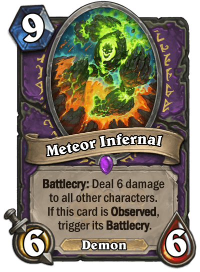 "Meteor Infernal was a card I originally proposed for Liftoff, but ended up not making it into the final product. If you’ve been following my designs for a while, you may also recognize Out in the Open, Chaos Burst, Burning Legion, and Velen the Divine as cards I’ve made before for different purposes. Sometimes it’s good to be “creatively lazy” and use designs you’ve used in the past."