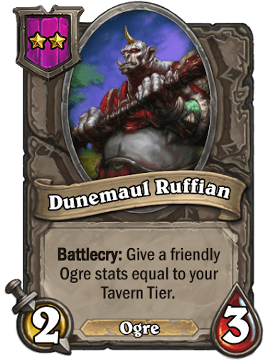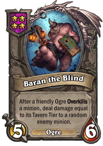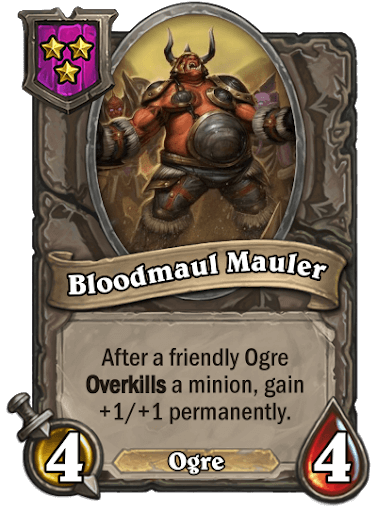 The second of three custom Battlegrounds tribes made by Cydonianknight to be featured this year was the Ogre tribe. This tribe focuses on the failed Overkill mechanic from Rastakhan's Rumble, placed into an environment where it can be used more effectively. Also featured here is the theme of your Tavern Tier.