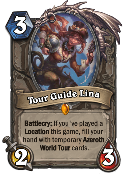 We've been going at it for a long time, so that's why we're taking a vacation. We've won a stay at a relaxing resort and full trip across Azeroth in this set. Azeroth World Tour is an unfinished set of mine that features two new card types: Location cards, which are pretty standard custom card type among the community and works exactly how other incantations of the mechanic do, and Hero Power cards (using the "Backpack" card template) which are cards that replace your Hero Power for a set number of uses (found in the purple circle in the bottom-right).