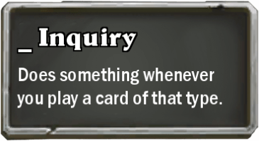 The ending result is a set that, in addition to not having a proper name, has a very different feel than a set designed in the typical way. The set features the Inquiry keyword which is an effect with several different variations and has an effect that activates after playing a card of a specific type.