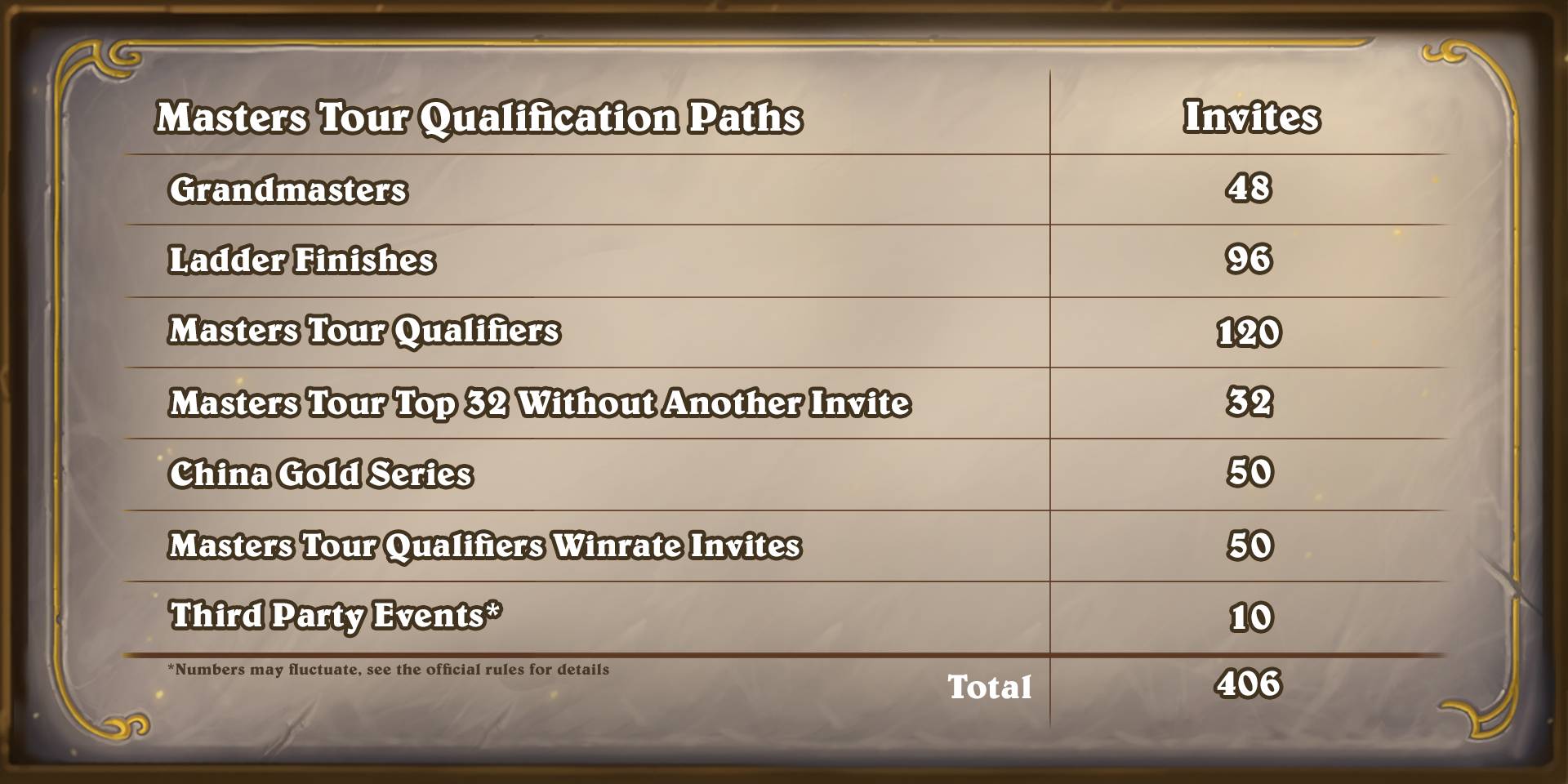 Quote From Blizzard For the final two Qualifiers seasons of the year, we are adjusting how players earn invites. Winning a Masters Tour Qualifier will still earn you an automatic invite, but to reward consistency players will now earn Masters Tour invites based on overall match win rates throughout a Qualifiers season instead of the current top 8 placements system. Beginning with the Qualifiers for Masters Tour Stormwind, the top 50 highest win percentage players that competed in at least 20 Qualifiers without placing first will receive a corresponding Masters Tour invite. This is up from an average of 30 invites for four-time top 8 finishers.