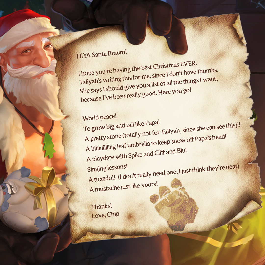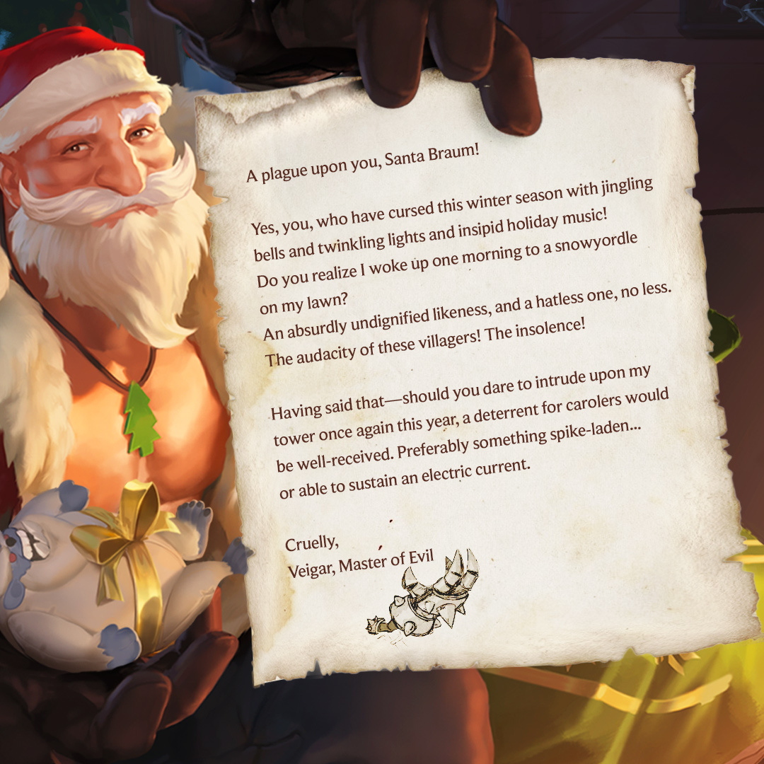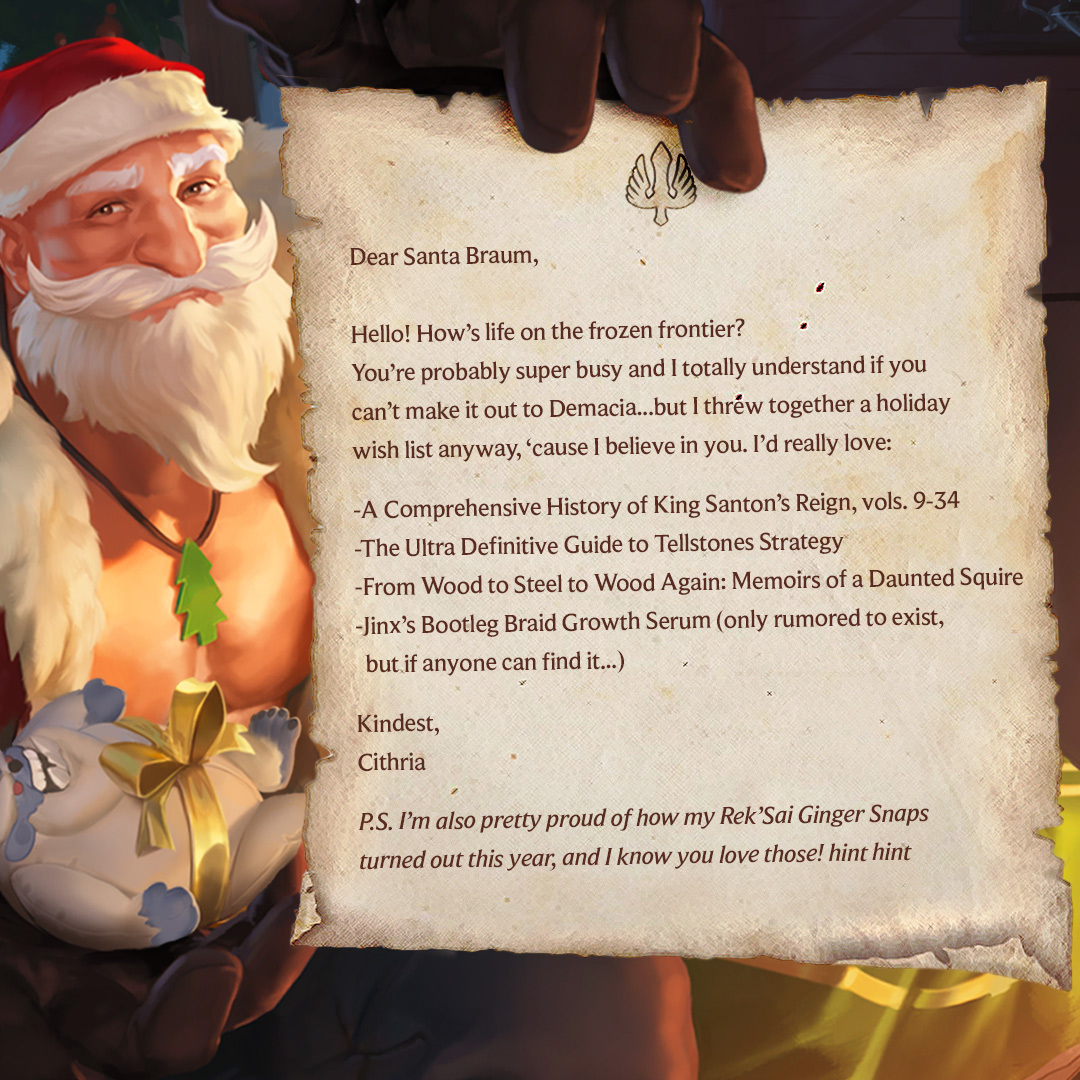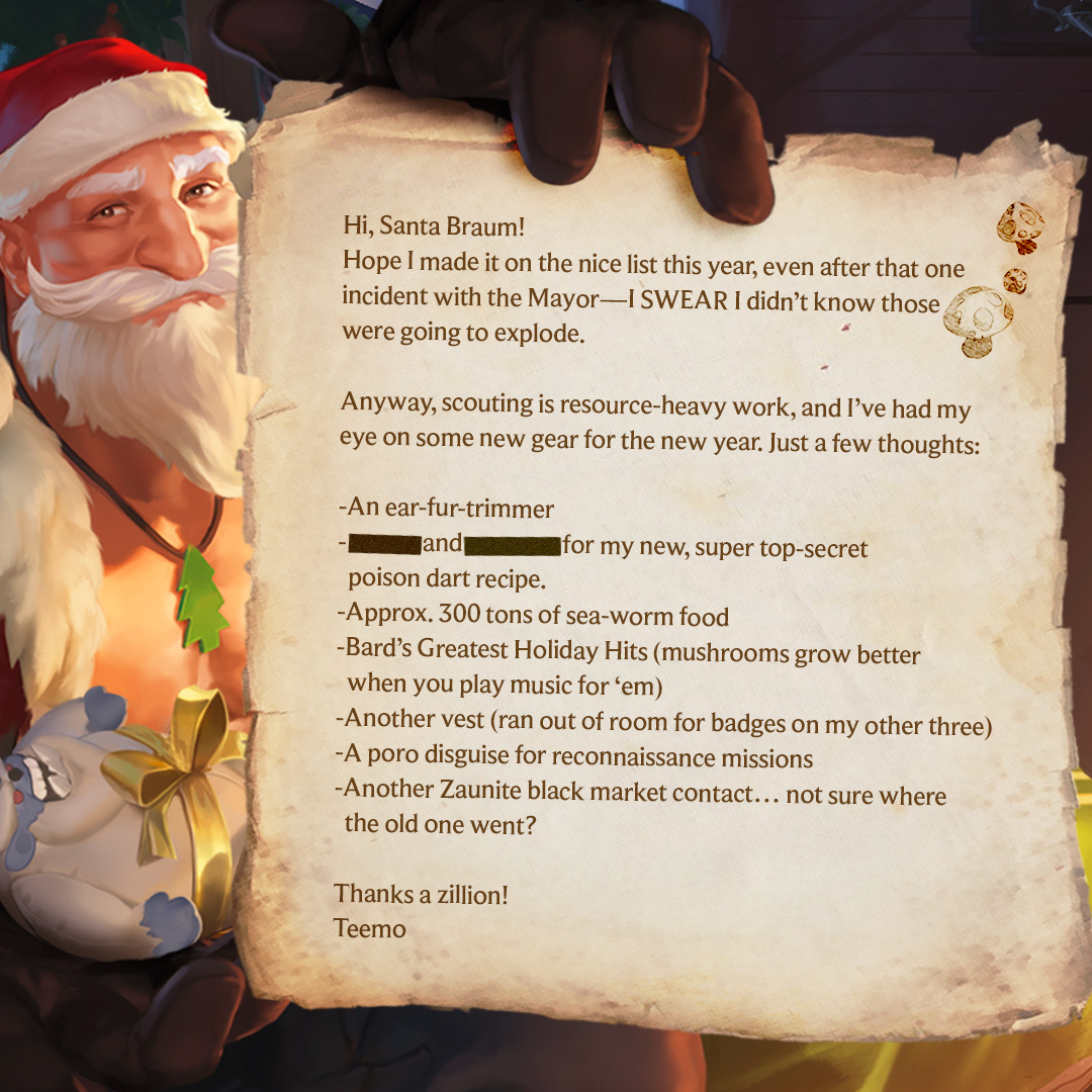 Over the past couple of weeks, Riot released a few Santa letters from various characters in the Runeterra universe. Veigar, Cithria, Chip, and Teemo all joined in on the fun to write letters to Santa Braum and we've got them all below for you to give a read. Before you do so though, take a guess at what they may have asked for!