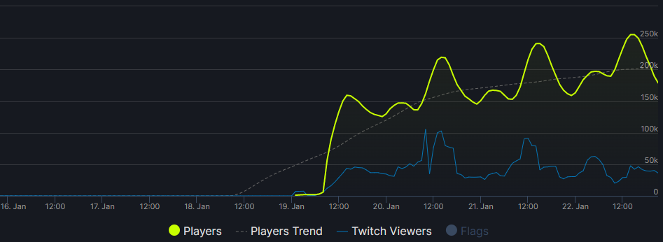 Master Duels concurrent player count since launch. Peak is 255,207 players.