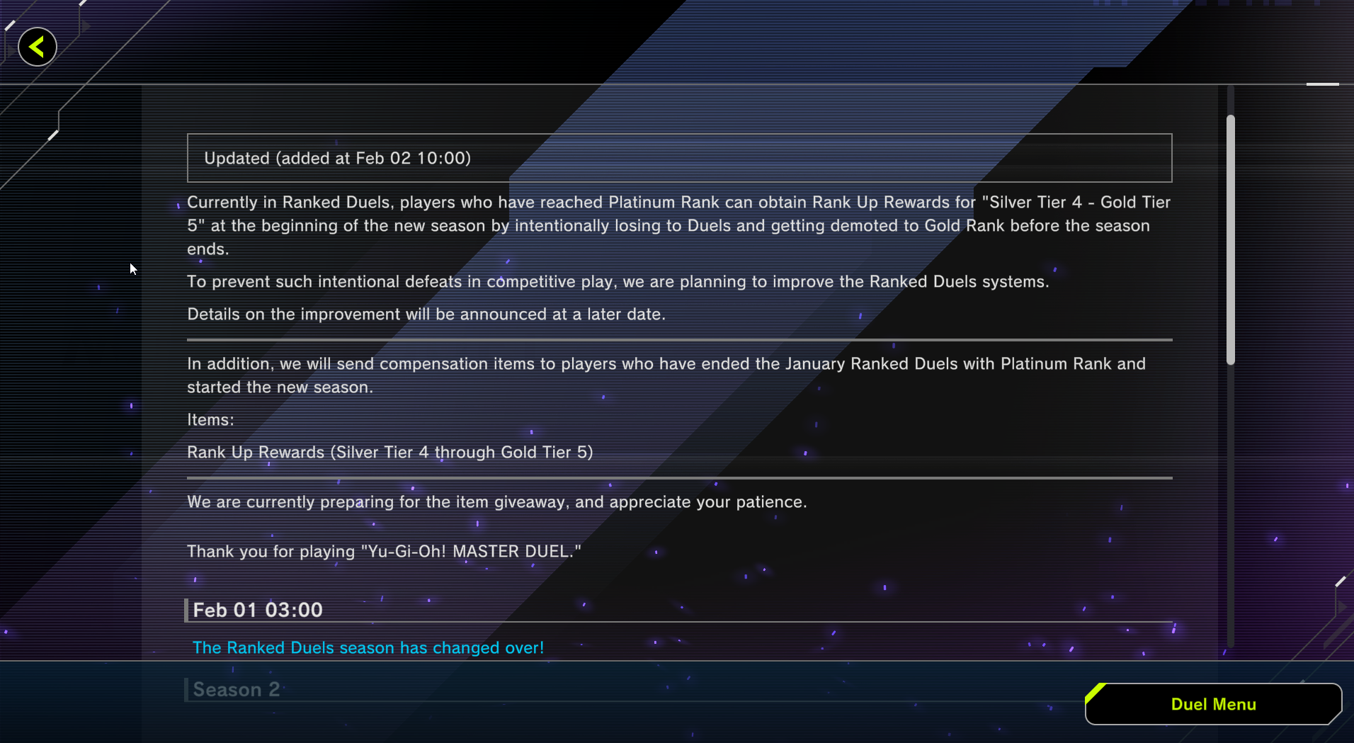Konami posted an update regarding unreachable Gems in ranked mode via Master Duel's in-game notification system. They will be sending compensation Gems for players that ended the ranked season in Platinum Tier in the coming months. The wording makes it sound like they'll be compensating for Silver Tier 4 through Gold Tier 5. That would translate to about 400 Gems.