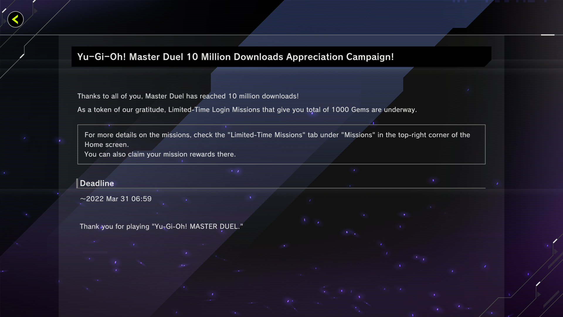 Master Duel has just reached 10 million downloads worldwide. To celebrate, Konami is giving away 1000 Gems to anyone who logs into the game until March 31st.