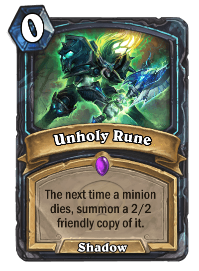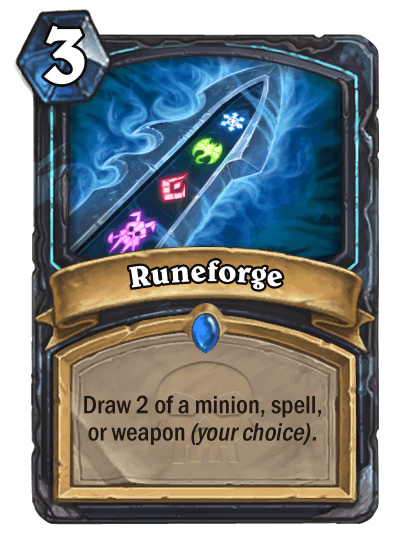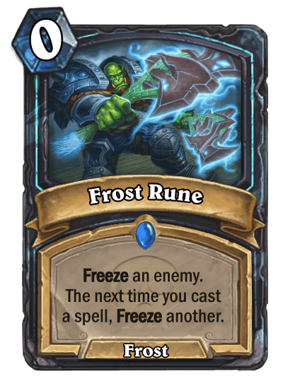 The class doesn’t come with its own keyword as there is no need for one. Instead the class makes use of interesting designed cards and unique side mechanics to form its identity. One of the class’ side mechanics are Runes; 0 Mana spells that activates when a condition is met. They are a combination of Secrets and Demon Hunter’s sigils except they can be activated on either players’ turns. Runes and runeforging is a big part of the Death Knight fantasy and it was a duty to fit that concept into the class somehow. Originally runes were going to be used as a class keyword but was later scrapped in the design process."