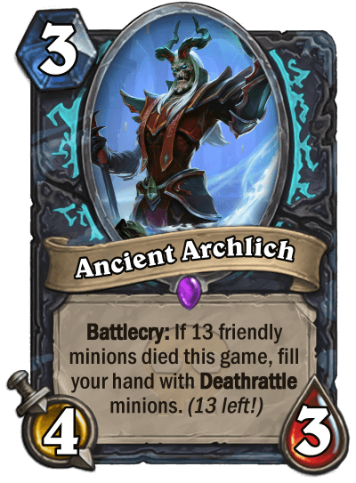 Dank: "There are three cards that stood out from the rest after finishing the starter set for the Death Knight. The first card is Runeforge, and for this one I just love the unique take on your typical 3 Mana draw two cards spell. Not only that but it is very flavorful given the idea of runeforging. The second card, Ancient Archlich, is designed both as a meme and as a strong late game value engine as long as you meet the requirements. This card is also beloved by me for its design. The last card is well liked from a flavor standpoint. The bonus effects given are the same ones from the Adventurers in the Wailing Caverns miniset, and they both share the same stats as Ghouls."