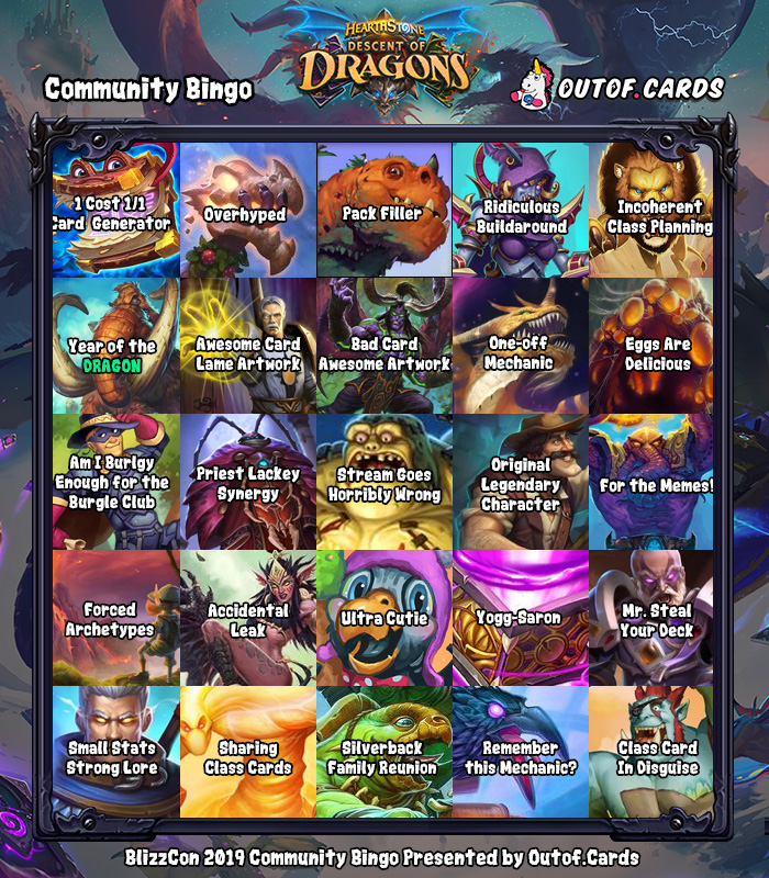 It's our first BlizzCon here at Out of Cards. We've just had the new expansion, Descent of Dragons announced and we got to see a few cards to demonstrate what the set is going to be about. But in addition to our BlizzCon bingo, we've also got a reveal season bingo! After a card is revealed that fits one of these categories, we'll cross that space off. If we get 5 in a line, we get a bingo. How many squares will we cross off by the time we see all the cards?
