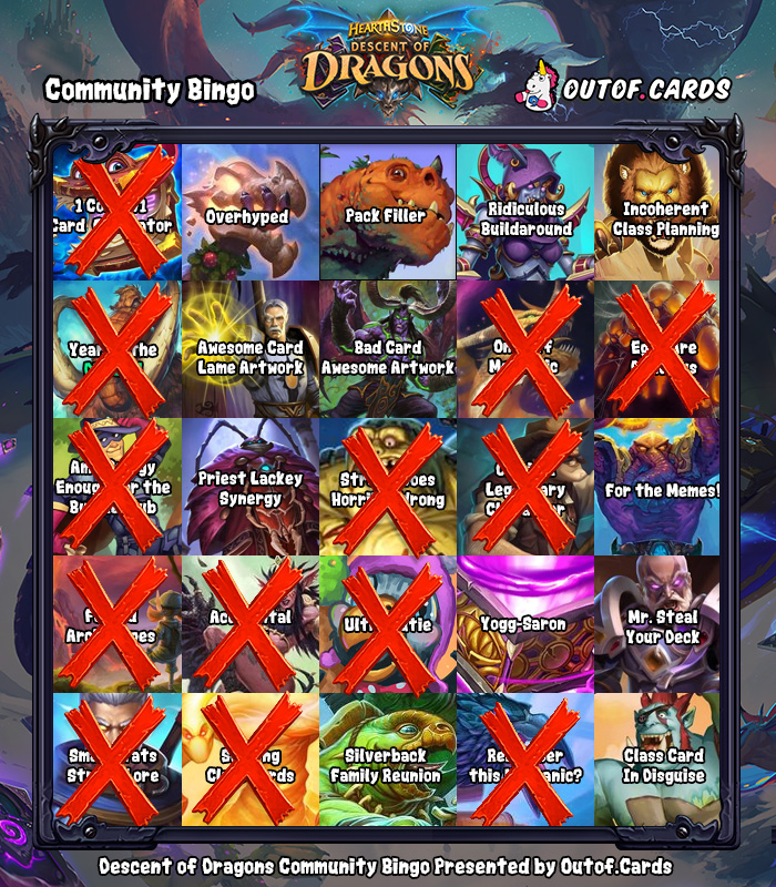 Well... It depends on how you look at it. The original intention of the Year of the Dragon square was that it was supposed to be crossed off if we got through the set without many Dragons (poking fun at the fact that we went two full expansions with almost zero Dragons in this year). Unfortunately, the announcement that every class would get a Legendary Dragon ultimately killed the square on arrival, and there's still plenty more to come.