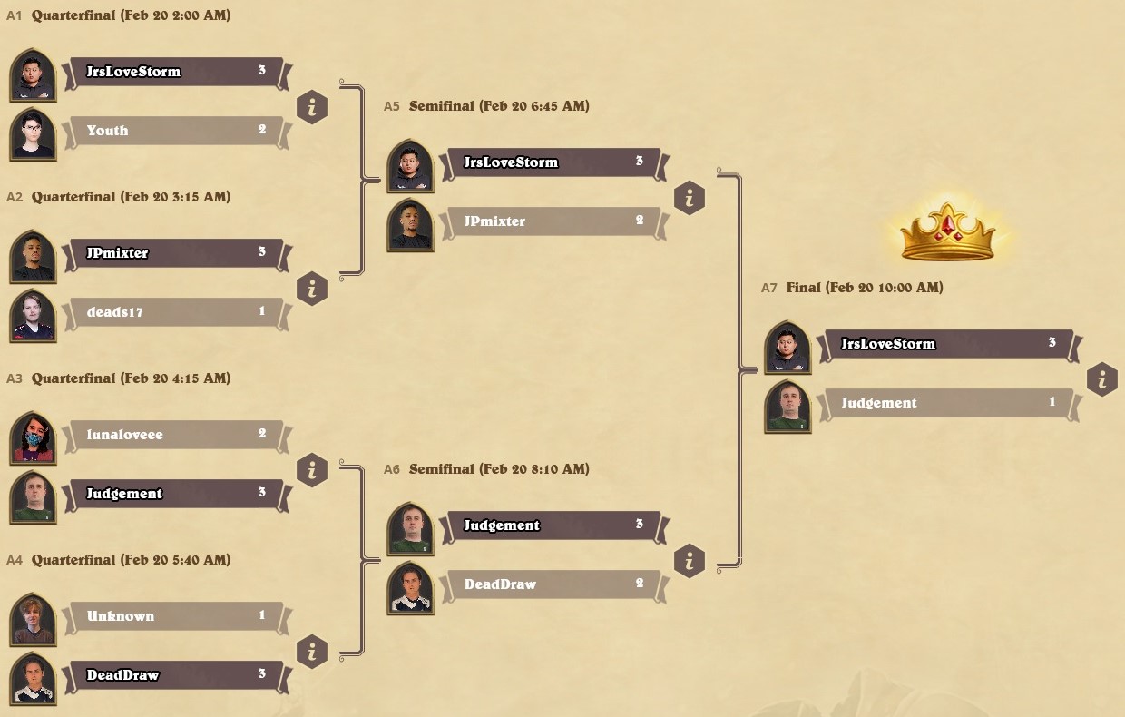 However, the grand prize eluded all of them as the Chinese JrsLoveStorm was able to take home the victory with his unique lineup after beating his compatriot Youth in quarterfinals, Brazil's first semifinalist JPmixter in semifinals, and Judgement in the grand final. This meant that JrsLoveStorm also managed to become a rare #1 seed winner as he had won the Swiss portion with a perfect 8-0 record, bringing his tournament total to 12-0.
