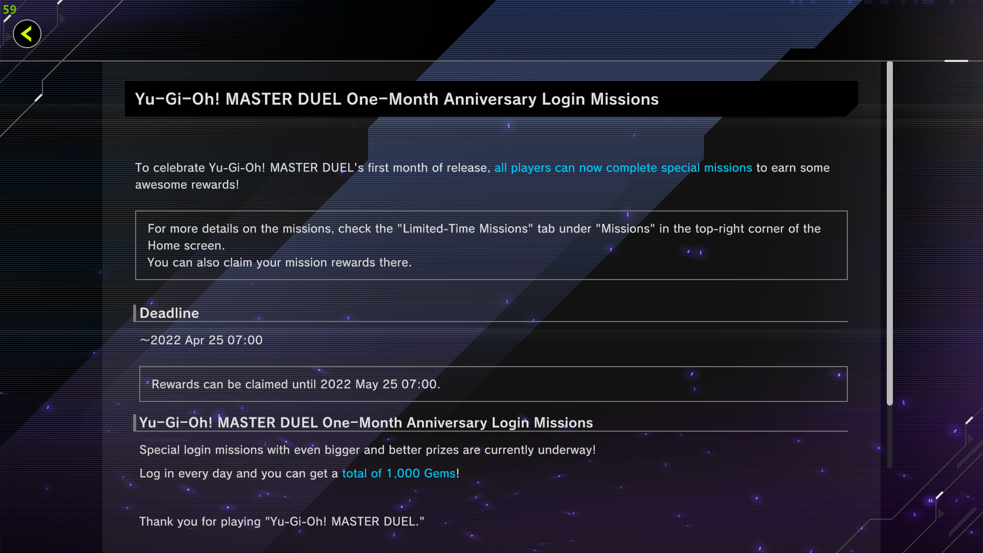 Yu-Gi-Oh Master Duel launched over a month ago, and Konami is giving everyone a lot of Gems to celebrate the occasion. Right now, everyone gets a special mission chain that will award players to 1000 gems if they log in over 3 days. They are the first thing you see when clicking on the 'Missions' button.