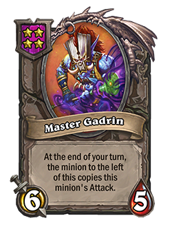 I haven't had a chance to play with this one yet, but from what I've seen played against me, the combination of the Buddy and Vol'jin's Hero Power makes for a pretty good synergy. The fact that the buff is permanent is most likely the reason behind the nerf, so you cannot just pump the attack of your entire board in 2-3 turns, but it will be a more dedicated strategy and you cannot change minions on the fly as much. It will still be a decent power-up, since you can gradually work towards your first big attack minion and on the turn you get Gadrin, instantly swap the stats and either buff the original minion back, or something else and keep going. This is extremely good to buff up new Divine Shield minions or Cleave/Windfury ones. The fact that it buffs the minion on its left is important, as it allows you to still go first with the Cleave/Windfury minion right away.
